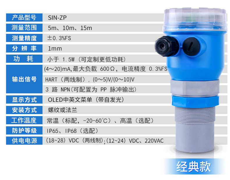 聯測儀表SIN-ZP超聲波液位/物位計產品特點:±0.3%高精度、五檔濾波,穩定測量